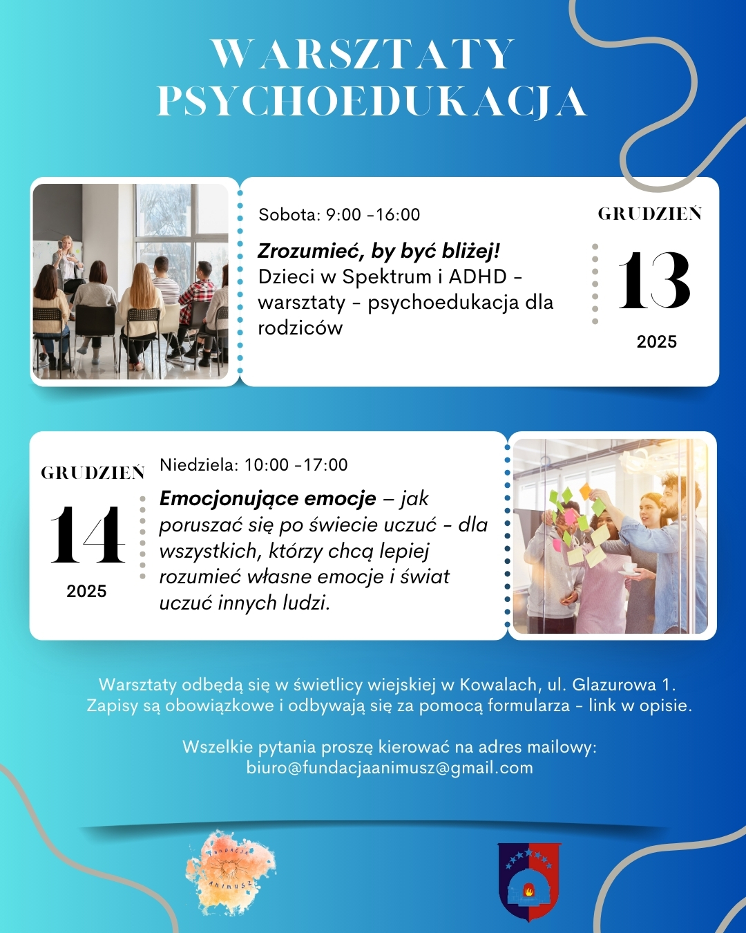 W imieniu Gminu Kolbudy oraz Fundacji Animusz serdecznie zapraszamy na dwa bezpÅ‚atne warsztaty psychoedukacyjne, które odbÄ™dÄ… siÄ™ 13–14 grudnia 2025 r. w Å›wietlicy wiejskiej w Kowalach (ul. Glazurowa 1). Poniżej znajduje siÄ™ tematyka i harmonogram spotkaÅ„.